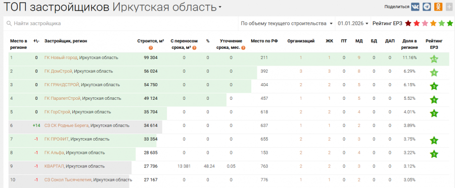 Единый ресурс застройщиков опубликовал ТОП девелоперов Иркутской области по объему текущего строительства по итогам 2025 года.