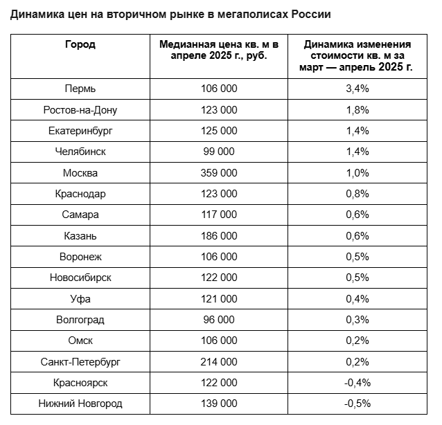 Среди российских миллионников наибольший рост цен показала Пермь (+3,4%), Ростов-на-Дону (+1,8%) и Екатеринбург (+1,4%). Лидерами по стоимости остаются Москва (359 тыс. руб./кв. м) и Санкт-Петербург (214 тыс. руб./кв. м), тогда как в Челябинске и Волгограде цены не превышают 100 тыс. рублей за квадратный метр.